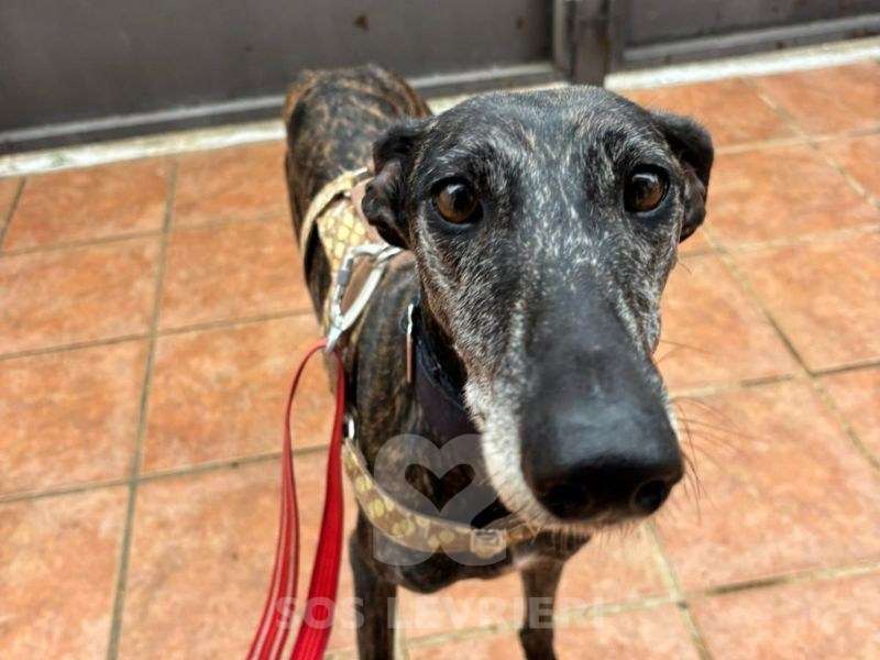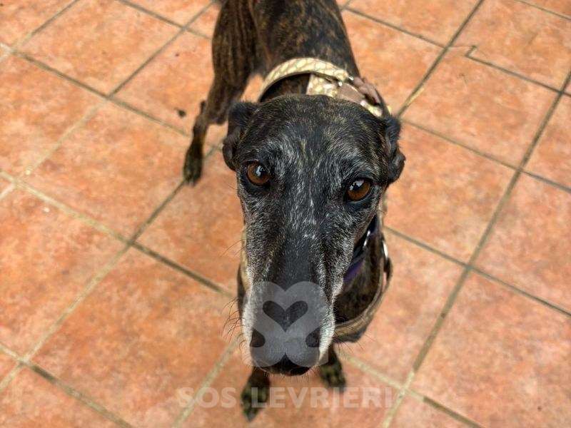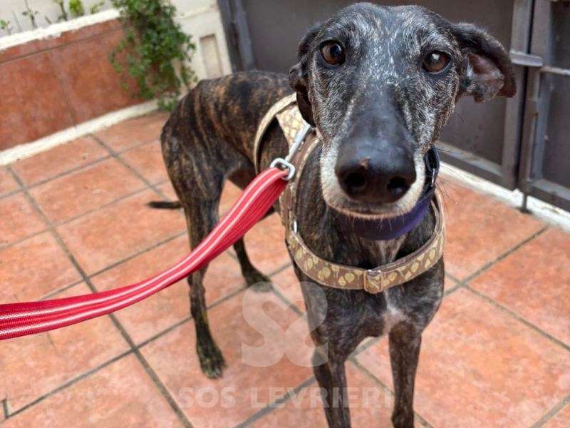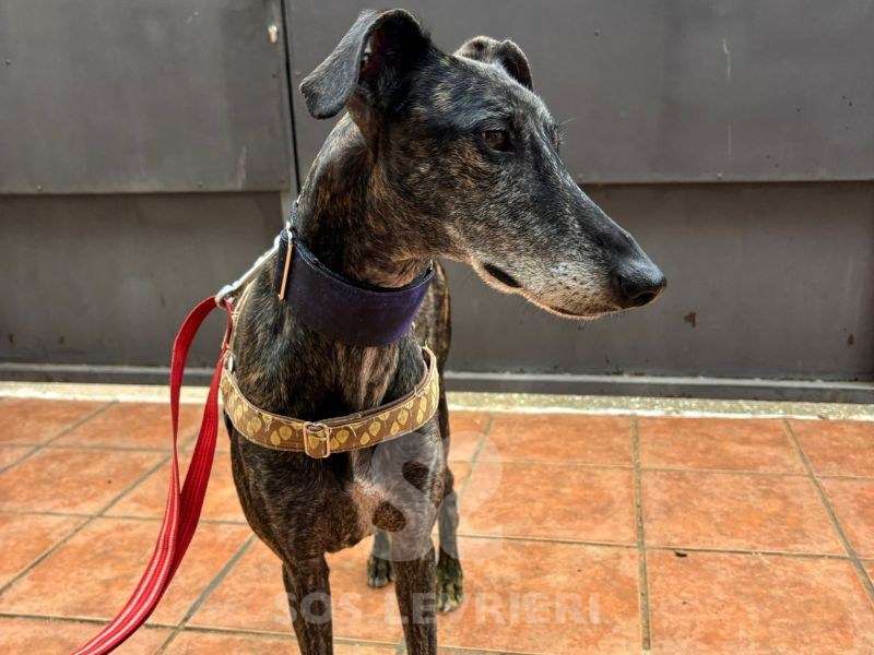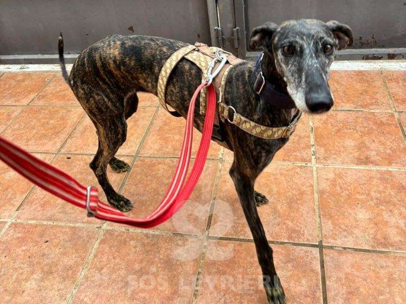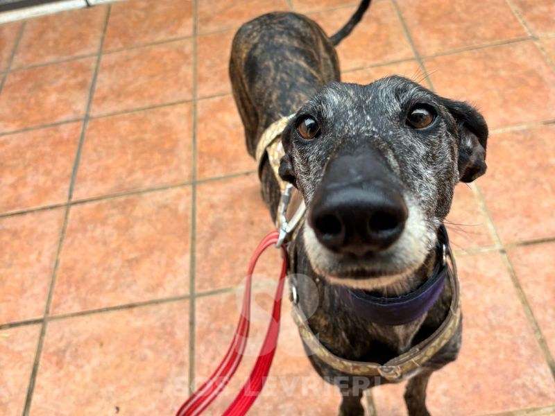 Chispa significa “scintille” perché il suo manto tigrato, quando riflette la luce, crea dei punti di luce dorati meravigliosi. E’ una femmina di Galgo Spagnolo di circa 6 anni dal carattere eccezionale.