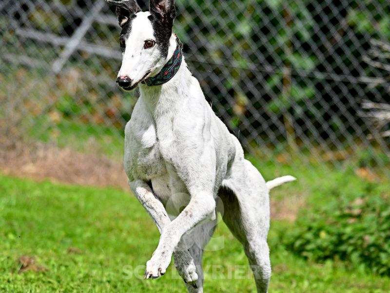 Mary Jean è una “coursing”, non ha mai corso ma ha fatto cuccioli ed è stata usata per accudire i giovani Greyhound.