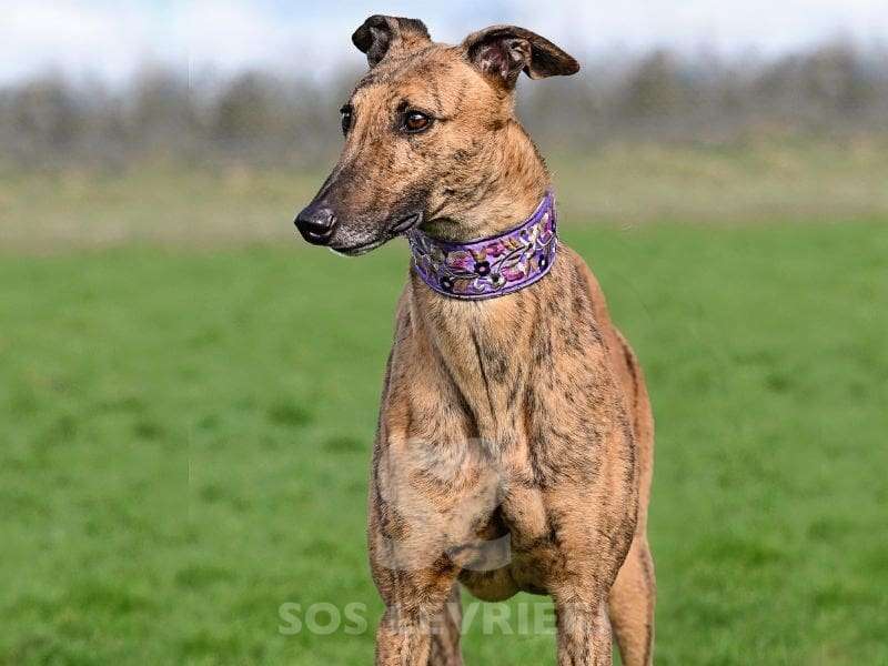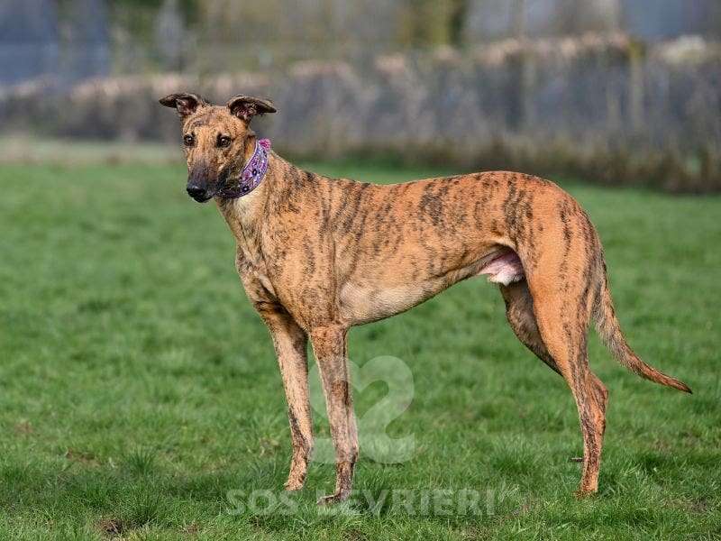 Mustang è un maestoso Greyhound Irlandese dal manto tigrato, elegante e fiero ma con il cuore tenero tenero e gli occhioni languidi da vero “Principe Azzurro”.