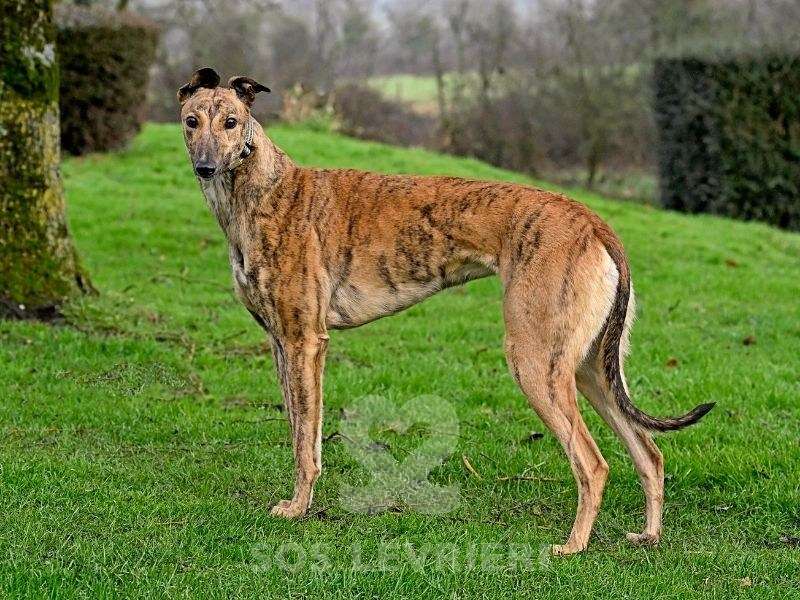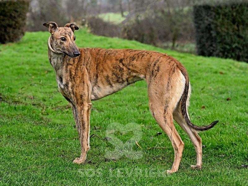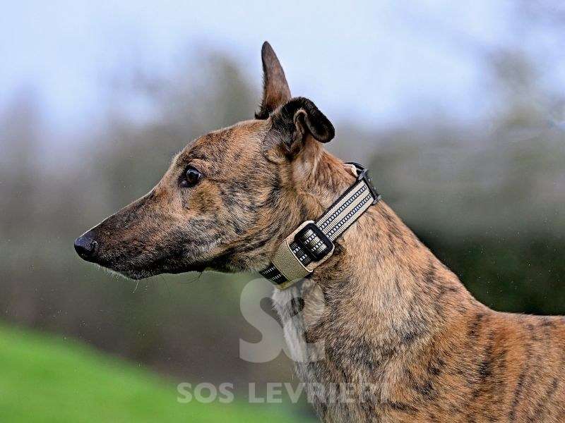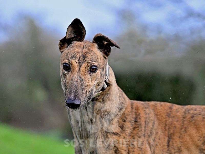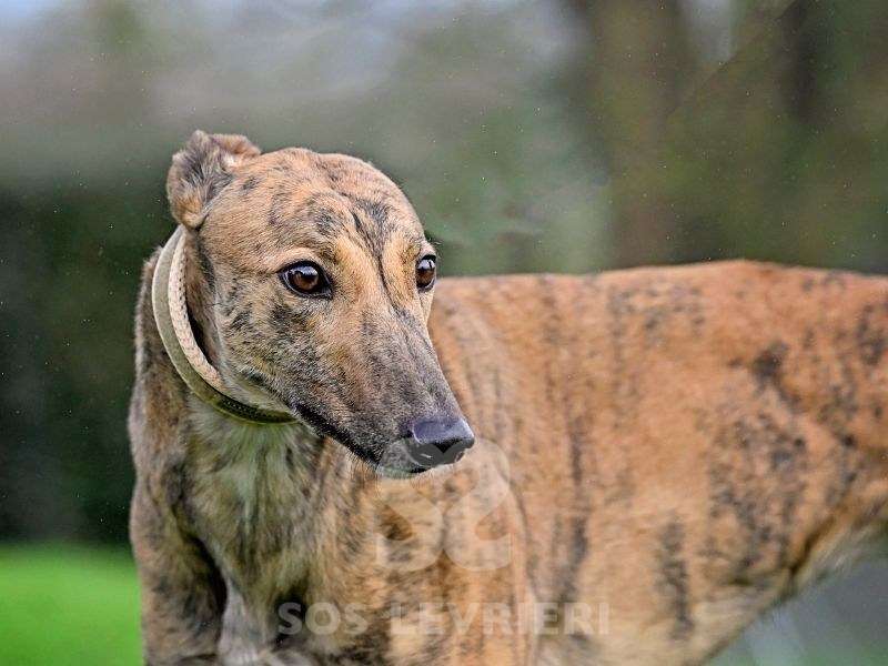 Vi presentiamo Pinky, una splendida e raffinata Greyhound dal mantello tigrato, dallo sguardo intenso, elegante e piena di dolcezza.