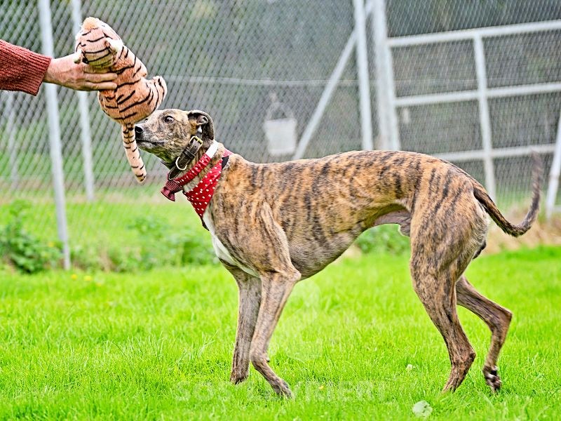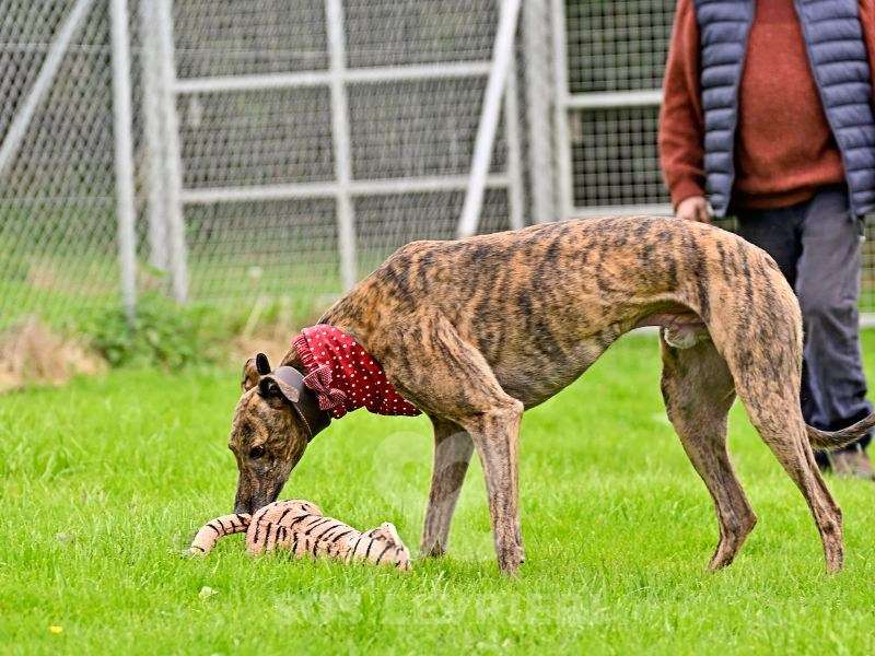 Rory è un maestoso Greyhound tigrato, di una bellezza elegante e naturale, ma ciò che colpisce di più di lui è il suo carattere meraviglioso:basta guardarlo negli occhi per capire quanta dolcezza racchiuda dentro.