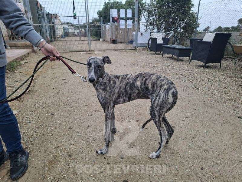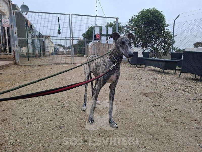 Taylor è un bellissimo cucciolo di Galgo Spagnolo dal manto tigrato grigio, con colori e strisce molto particolari.