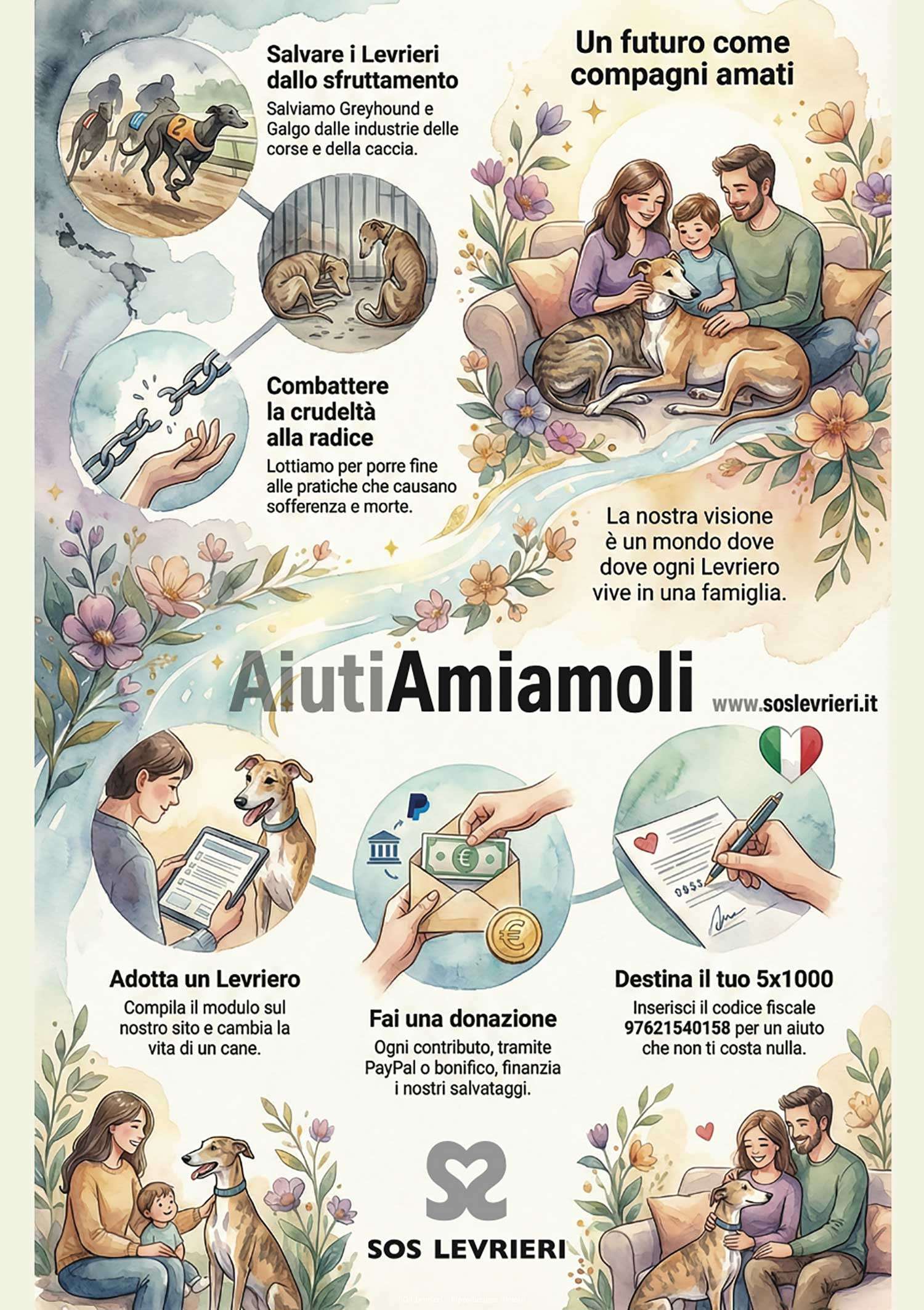 L’immagine rappresenta il percorso che conduce dal contrasto allo sfruttamento e alla crudeltà verso un futuro basato sul rispetto, sulla cura e sull’adozione consapevole. Una rappresentazione semplice e diretta, pensata per sensibilizzare e mantenere viva l’attenzione sulla condizione dei Levrieri.